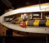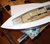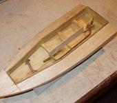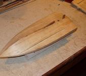 После того как окончательно собрал корпус обклеил тонкой стеклотканью (не знаю какой толщины просто авиамоделисты дали кусок). Обклеивал так, положил сверху на днище и борта и пропитал с помощью кисточки смолой разведенной спиртом, в принципе пузырей не было, только в складочках возле реданов пришлось подправить когда смола начала густеть. Аналогично палубу, транец и крышку. Получилась как лакированная, только на отсвет видно текстуру ткани. Целиком корпус с крышкой получился весом 188 гр(уже окрашенный, два сезона ездил «деревянным»).