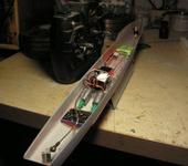 Аппаратура пока что от вертолета 4х канальная, регулятор без реверса, но с раздраем, моторчики какие были, микро серва, 2е пластинки лития 480ма\ч.в ванной стоит и ходит, все вертится, руль работает.Балласт в виде свинцовой дроби.собираюсь все свободное пространство заполнить пенопластом для непотопляемости…пока что не придумал как сделать палубу съемной…красил и акрилом и эмалью из баллона.качественная обработка всех деталей, шпаклевание и т д присутствуют.