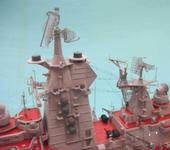 Ни на одной фотографии не видел салютных пушек на баке. Они на модели стоят в другом месте. Корабль служил долго, поэтому мог в процессе службы меняться внешне. Мне например говорили люди, служившие на нем, что командирский катер был белого цвета. Плотиков белых тоже на фото не видел, только шаровые. Палуба может смотрется и ярче в прцессе подсветки при сьемке. Кабель отпугивания КР есть. Может не видно фланцев с заклепками, так это 350 масштаб. Модель делалась по реальным фотографиям “Кирова” в период когда он носил бортовой 092. У нас на конкурсах и соревнованиях все что сделано на модели должно быть подтверждено информацией (фото, чертежи, схемы). Если допустим я покрашу спасательные плотики в белый цвет, но не смогу подтвердить это фотографиями, снимут баллы, потому что стандартный цвет на военных кораблях шаровый. Белыми были не на многих. Если есть фото подтверждающие то что вы сказали, пришлите в личку. Учту на следующем.