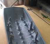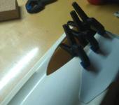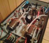 Двухмоторную схему решено было оставить, что с одной стороны создало проблемы, с другой стороны интереснее было их решать. Каналы вырезались и заклеивались плоскими листами полистирола. Направляющие трубы для дейдвудных трубок делались заново. Моторы смещались ближе к середине как из соображений развесовки, так и за счёт многих других параметров, например угла наклона дейдвудов, степени вылета винтов за пределы кормы, ну и т.д. Для большей жёсткости корпус внутри промызывался полиэфиркой и укладывался стекломат в один слой. Стойки для крепежа верхней части корпуса фиксировались уже на эпоксидку. Кое-где применял эпоксидный пластилин Milliput и Момент Эпоксилин. Красил в пять слоёв : грунтовка для пластика, грунтовка непрозрачная, золотистый акрил, графитовый акрил, финишный прозрачный лак. По моторам - установлены два инраннера Turnigy
