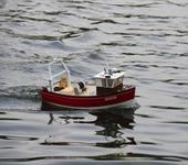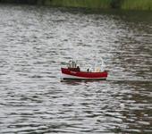 Вот попытка превратить игрушку,во что то похожее на модель.Правда размером по больше,85см и весом около 5кг,но обводы очень похожи на вашу.Обороты на полном ходу-7200,винт-40/0.75,потребляемая мощность от батареи 10вольт,составляет 25Вт,скорость примерно 7 узлов.Для экономии места и энергии от батареи,установлен безколлекторный привод.Для переноски,использую сумку для “челноков”,размером 80х80х40,благо носить не далеко,пруд рядом.