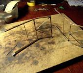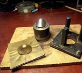 Две мет. пластины между ними зажимаем лист отпущенной латуни или меди(зажимать не сильно,я гайки крутил руками). Давилкой давим. Можно в тисках( я давил прессом). Направляющие приварил, чтобы сцентровать давилку с пластинами.