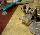 Две мет. пластины между ними зажимаем лист отпущенной латуни или меди(зажимать не сильно,я гайки крутил руками). Давилкой давим. Можно в тисках( я давил прессом). Направляющие приварил, чтобы сцентровать давилку с пластинами.