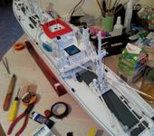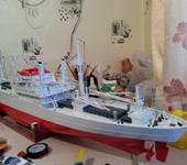 Длинна модели 108 см, ширина- 14 см, масса около 2,5 кг. На данный момент судно почти собрано, Ходовые испытания судно прошло в ванной (зима на дворе 😦 )