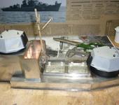 Вес 7 кило. Движок один. Скорее всего поставлю ДПР. Он низко оборотный и тихий. Скорость прототипа 18 узлов ( 33 км\час ) Обводы прогонистые и осадка маленькая. Так что много мощи и оборотов ему не надо. Обещали сделать имитатор двигателя.