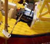 По поводу работы вёсел. Схема очень простая получилась, в конечном итоге, хотя пришлось довольно долго повозиться с регулировкой. Конструкция видна по фото, где палуба снята с модели.