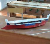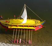 Да, с управляемостью не очень. Корпус из потолочки получился очень лёгкий, пришлось добавлять балласт. Модель плоскодонная, поэтому её сильным ветром сдувает с курса. Лучше, конечно, иметь возможность раздельно грести вёслами правого и левого борта (на этой модели они работают синхронно). Но если ветер не мешает, двух рулей с широкими лопастями достаточно, чтобы поворачивать. Сама скорость, конечно же, зависит от частоты гребков. То есть, этот кораблик может плыть гораздо быстрее, чем на видео.