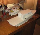 …И так продолжаем: Зашив борта и днище,изготовляю транцеву наделку и приклеиваю ее к транцу.В последствии выяснилось,что она не совсем копийная,но я сделал ее под свои задачи и она меня устраивает.Переделать не долго.Переварачиваем корпус,устанавливаем на заранее приготовленную подставку и режим палубу-стапель,так как палуба за рубкой ниже основной.Срезаем часть трех последних шпангоутов,до уровня бортов и вырезаем в верхней палубе отверстие под рубку. Проклеиваем стыки днища и киля.И получаем маленькую засаду-так как палуба приклеена к бортам и шпангоутам,получилось не съемной-не могу добраться до носовой части корпуса.Судя по чертежу ,там должна быть съемная носовая часть палубы,по- мимо двух лючков-будем резать…