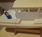 Корпус и палуба - единое целое, с вклеенным транцем и фанерным шпангоутом. Сделан не из АБС пластика, как раньше. Пластик жесткий, толщиной около 2мм. Из этого же пластика сделана крыша надстройки;