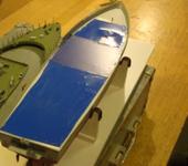 Вот фотки, если мелковато перешлю исходники. Двигатель один 4,8 В, чтото типа спида 200. В корпус вклеена фальш палуба с вырезами для доступа. Выреза перед пусками заклеены самоклейкой. В носовой части вывод под антенну (разьем мама). Основная палуба со всеми деталями крепится винтами к фальшпалубе, винты скрыты деталями - грибками вентил. и лючками. На фото внутрянки нет акк. и приемника, серва мини.