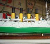 Да, на фотографиях модель «Варяга» из ЦВММ выглядит именно так, как Вы и сказали (ватерлиния как таковая не нарисована, а есть просто граница между красным днищем и белыми бортами)! Вот только в глаза бросается то, что стволы и станки орудий не покрашены, в то время как на фотографиях самого крейсера стволы черные, а станки белые (я имею ввиду парадный вариант окраски)! Может быть орудия в начале устанавливали, а красили потом (в чем я сомневаюсь)? Даже если это и так, то вряд ли это был секрет для тех, кто строил эту модель, тем более, что это построечная модель! Кстати, «Варяг» не исключение – на некоторых других моделях ЦВММ орудия тоже не покрашены (например эскадренный броненосец «Петропавловск»). Интересно почему?