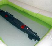Т.К. до близжайшей воды примерно 1 км, пришлось купить надувной бассейн 3 м x 2 м и в подвале оборудовать место для этой операции. Доложил 16 кг свинца. Вес лодки 31 кг. (еле-еле смог поставить её на воду, а затем вытащить из воды). Думаю в носовую часть ещё доложить 200-250 г свинца.