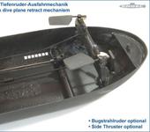 Лучше конечно повозиться и сделать носовые рули подруливающими. так как ее будет гораздо проще загнать под воду, к сожалению не вижу конструкции вашей лодки, но сделать подруливающими носовые особого титанического труда не нужно, сложнее если они еще и убирающиеся. а так сажайте рули на металлический штифт, возьмите полоску латуни или меди, просверлите отверстие соразмерное диаметру вашего штифта и ниже, милиметров 8-10 отверстие 1,5 под соединение сервы. вообщем вот прилагаемое фото, как это выглядет, причем не фото с убирающимся