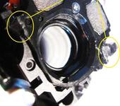 В этой камере требуется снять блоки затвора, фильтра, привода фокусировки, оптопары и отпаять два вывода питания линейного двигателя трансфокатора. Далее линзоблок разделяется на две части. Здесь мы и увидим блок стабилизатора. Все что требуется - нужно нанести две капли термоклея (черного) на два диагональных угла. На фото внизу указано желтыми кружками. Это обеспечит полную неподвижность линз стабилизатора. Клей лучше всего наносить тонким жалом паяльника. Излишки необходимо срезать, чтобы это не мешало линзе фокусировки. Применение термоклея позволяет легко и быстро вернуть камеру в изначальное состояние не прилагая излишних усилий.
