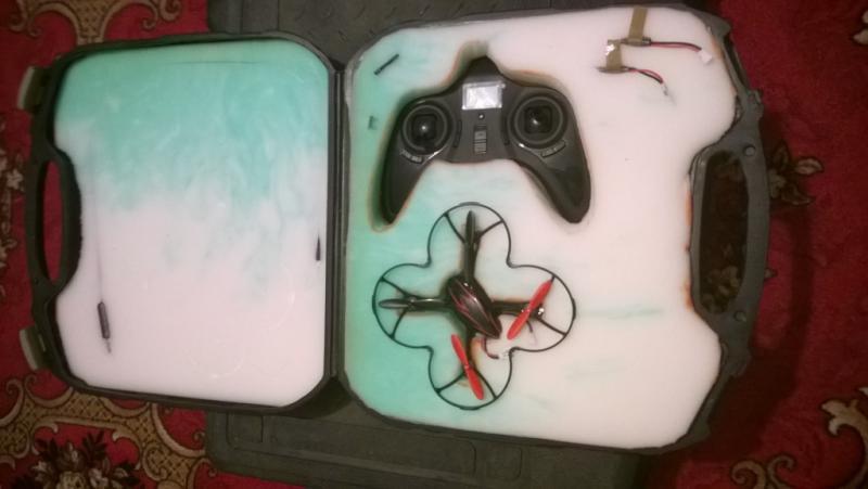 Купил БУ кейс от 650 класса. Ложемент выкинул, тут заказал листы (100 рублей за лист!) и сам вырезал, под свой гексакоптер. Чемодан и коптер успешно пережили путь длинной в ~9000 км. В ящик влез пульт, 3-х осевой подвес gopro, экран 7".