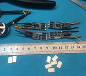 Регули оснастил каждый парой мелких радиаторов на силовые ключи, когда-то писал, но кажись без фото, исправляюсь. Пластинки алюминия должны быть ровными и плотно прижаты к корпусам транзисторов, ничего нигде не замыкая. Зафиксировано двумя слоями термоусадки - ничего не греется от слова совсем, даже на 3S, о чем ниже.