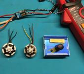 Закончил буквально полчаса назад, все тесты потом. Главное - получилось, и вроде очень неплохо… расчеты то показывают возможность получить отличные характеристики, если хоть половина правда - уже хлеб =). Итак, смотал родную обмотку (“звезда”, по 14 витков на зуб, мотается сразу тремя проводами диаметром 0,2мм, окно заполнено хорошо, хоть и намотка неряшливая), быстрой эпоксидкой замазал пару сколов изолятора со статора и стал рыться в проводах. В идеале под мои цели надо бы мотать двумя проводами диаметром 0,25…0,26, но таких, как назло, ни кусочка не нашел, а попробовать горело. Надо было уместить 19-20 витков на зуб, в два провода по 0,3мм - не лезет, также как и одиночный 0,4мм. В итоге намотал одиночным проводом диаметром 0,32мм - влезает хорошо, а сечение маловато конечно, но выдюжит легко. Пока успел прицепить к сервотестеру через рег 20А и бегло “заценить” дальнолетный проп 8038 SF буквально в руках. Родной движок его даже на 2S не тянет, ток на макс. газу почти 10А. А вот 1200kv - спокойно. Тягу пока не измерял, но если хватит - на 2S, похоже, будет очень эффективная ВМГ, хоть и крайне вялый коптер выйдет… На 3S lion тот же движок тот же пропеллер крутит до максимума, тянет зверски, но жрет при этом 6А - чуть более 70Вт мощность, хватит с головой (я опасался, что из-за тонкого провода не хватит “дури” для нормального полета). После нескольких секунд на максимуме двиг, конечно, теплый, но это режим скорее аварийный. При этом ВМГ работает очень тихо, понравилось. Еще успел цепануть проп от 501-го хабсана, второпях дал разу и чуть не упустил движок - рвануло так, что еле удержал! В общем, пропы от 501го или 7038 SF могут оказаться вообще супер, сделаю простенький стенд, замерю… нигде не видел тестов похожих моторчиков пока. Как обычно - пара фоток…