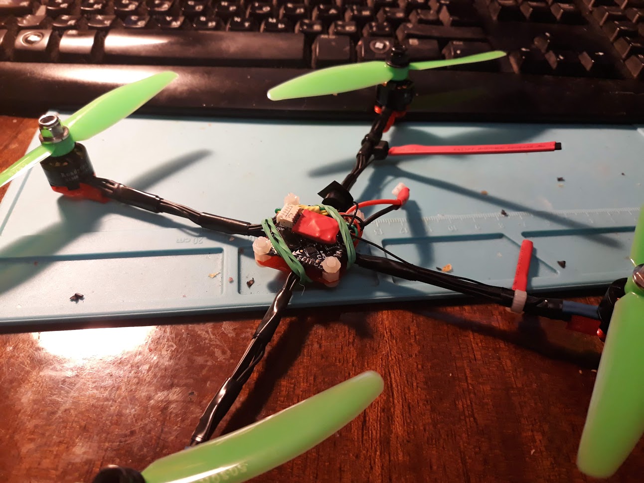 Тоже под 5030 пропы, но моторы 1306 3100kv (маловато кв, газ висения 50-70%), с ПК beecore brushless, с 700mAh 1S батареей висит 15 минут. Чисто экспериментальный.