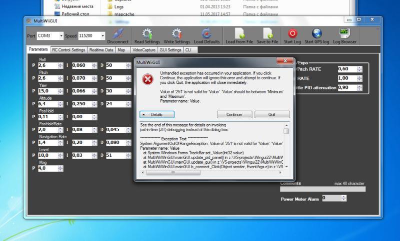 Здравствуйте! Такая проблема. Пока показатели менял в multiwii выскочило окно.Теперь ничего изменить не могу, каждый раз при коннекте выскакивает это окно. Мультиви переустанавливал. Мозги обновил и все равно история повторяется