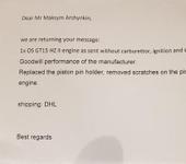 Прошло более чем полтора месяца с тех пор как я отправил свой первый мотор на гарантийный ремонт продавцу и сегодня продавец написал, что посылка с моим мотором пришла к ним от О.S. Больше никакой информации он мне не сообщил. Но я надеюсь, что в посылке приехал не тот металлолом что я им отправил 😃, а как минимум отремонтированный, а в идеале новый мотор.