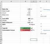 Ниже линк на расчет. Можно скачать и менять параметры выделенные только жирным шрифтом. Результат - зеленым это подъемная сила ротора, а красным крутящий момент в авторотации.