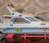 Приёмник в данный момент стоИт от аппаратуры Radio 3ch (27 mHz) - была в комплекте к Goldeagle XL. Распаянные на поате сервы выкинуты напрочь, вместо них подключена серва от аппаратуры “Сигнал”. Для её установки расточено бывшее крепление стандартных мотоустановок. Вместо стандартных - 2 мотоустановки Graupner Multispeed 140. Аккумулятор (нет на фото) - 6 банок 900 mAh. Идёт катер неплохо, не FSR естессно - но из воды на 1/2 корпуса выпрыгивает в лёгкую 😃 Манёвры правда делает лениво…