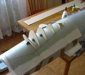 можно оклеить марлей на ПВА (она выполняет функции арматуры и не дает вылезти швам на пенопласте, если они имеются), прошпаклевать обычной латексной строительной шпаклевкой и ошкурить. Перед выклейкой следует покрыть болванку разведенным ПВА (чтобы не впитывался разделительный слой) и нанести разделительный слой (восковую мастику, мыло etc.). Вместо двух последних операций можно обернуть болванку тонкой полиэтиленовой стрейч-пленкой, в которую заворачивают продукты в супермаркетах) - однако это возможно не для всех корпусов (особенно если корпус имеет вогнутые поверхности).
