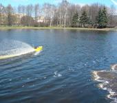 мотор на резинках от вазовского вентилятора.С отделкой боялся глубоко шкурить на углах чтобы не повредить стеклоткань .красил валиком с малярами не договаривался т.к. отделка не блеск. винт был обломан буратиной после чего обе лопасти были скруглены по симметрии и зря .с одной не сломанной лопастью не сбалансированный винт ездил лучше в след раз при необходимости буду пилить только ломанную лопасть .учитывая что дисбаланс будет дикий.новые винты заказаны к сезону я думаю будут.Сергей вы правы наверное шрут будет вибрировать но железина массивная будем посмотреть если что переделаем.было предположение что такое положения шрута даст меньше сопротивление.просвет без дейдвуда 45 мм т бар 50мм от двигателя.с весом беда не могу нащупать источник хорошей фанеры в питере. летом думаю озабочусь выклейкой корпуса из стекла посмотрим . всем спасибо за комментарии .