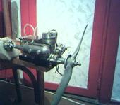 А вот и моя Радуга 7М на стенде (вон та большая медная штука - глушитель (работает очень тихо, можно в комнате запускать 😛 ) и бак самодельный примерно 100см. куб.) фоткал на телефон.