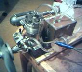 А вот и моя Радуга 7М на стенде (вон та большая медная штука - глушитель (работает очень тихо, можно в комнате запускать 😛 ) и бак самодельный примерно 100см. куб.) фоткал на телефон.