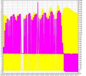 К стати вот тебе доказательство к выше написанному, глянь на первый график 1минута 2сек, (так для информации это я гонял квадратом, как только модель достигала максимум по скорости и по слуху оборотов делал резкий поворот, это почему такой график волнистый) но суть не в этом 1минута 2сек это я закончил подогнал модель и заглушил двигатель, что свидетельствует второй график оборотов, смотри то же время красный график, а теперь опять смотри первый, модель с заглущенным двигателем, не с того не сего выдала скорость 68км.ч причем тут же 64км.ч 😁, слабо с 0 оборотами развить почти 70км.ч 😁