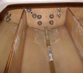 Сегодня в моделке крепил к стене кронштейны для хранения нового корпуса (купил катамаран Drambuie on Ice от MHZ). Кронштейны ставил над ранее установленными для Инсейна. Естественно Инсейн был снят и промерен на тему минимальной удобной высоты над лодкой. Так как у меня Инсейн с демонтированным мотором, и самой торчащей вверх детали – трубы тоже не было, прикидывал по ее поддерживающему кронштейну. При этом обратил внимание на то, что он слегка шевелится. При дальнейшем осмотре оказалось что у него ослабло крепление к транцу. Отвиньчивание крепежа исключил сразу – все ставил на жесткий фиксатор, отвернуть можно только с нагревом. Оказалось при эксплуатации от вибрации продавилась фанера усиливающая транец, может еще влажность помогла, лодка ведь. Дальнейший осмотр показал что ослабли также крепления струта и рулевого кронштейна…