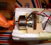 Работает с винтом 8х6 (бОльший не встанет по размеру - винт то толкающий и снизу фюзеляж), то есть новый тоже комфортно должен с ним работать. Крепление его мне вообще не понятно. Основание прикручено к фанерке, а к нему, вроде как - двигатель. Расстояние от фанерки до края пенопластовой стойки = 35 мм.