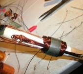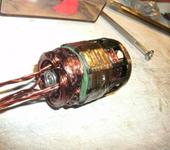 Оказалась у меня пара горелых 100-граммовых двухполюсных инраннеров Turnigy B2835-3900Kv, решил попробовать перемотать. Сопротивление исходных моторов было 44мОм, намотка выглядела очень корявой. Обычно обмотку таких моторов сначала формируют на специальной оправке, а потом вставляют в статор, но я решил попробовать сформировать ее прямо по месту, намотать в одну жилу толстого провода по-другому бы не получилось. Статор был вынут из корпуса и освобожден от горелой обмотки. Изначально там было намотано по 18 витков треугольником с перекрытием 180 градусов каждой обмоткой. В качестве остнастки использовал круглую палку диаметром с необходимое отверстие в обмотке под ротор и 12 подогнанных бальзовых палочек для временного заполнения зазора (позже заменил спичками из-за недостаточной твердости).