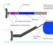 Поэтому думаю вот над такой конструкцией (см.рис). Трубка, в которой располагается мотор с регулятором и батарея. Ну и, конечно, гермопробка с сальниками вала, установленного на подшипниках и соединяемого с выходным валом электродвигателя.