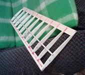 Он делает не из потолочки а из мелкошарикового упаковочного пенопласта порезанного струной на лист по 5, 10 мм. толщиной. По весу как потолочка но намного прочнее на изгиб. Потолочка на нервюры не идет, очень сильно изгибается. Если использовать потолочку то надо полки делать бальзовые.