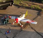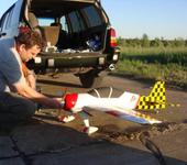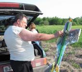 Из-за магнитов в хвосте получилась сильно задняя центровка с родным 1000 mAh аккумом, да еще и грузики я выкинул. Первый полет упорно держал его от крутого тангажа. Итог, при подлете к себе, отпустил стик, чтобы поймать самолет, а он прямо передо мной резко вверх и метров с пяти - шести носом в землю. Заднее оперение развалилось, но не совсем. Стаб вышел из защелок, РН остался на месте. Но не забываем, это морковка, хотя и не высокая. Вес 650 грамм.