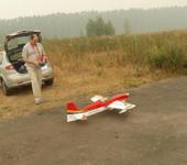 Сегодня облетал самодельную бензиновую Экстру. Размах 1920, длина 1780. Взлётный вес с дюралевым шасси 6700, с проволочным 6500. Мотор GF40 (Kit40). Самолёт летает устойчиво, триммеровал только по высоте (2 щелчка) Тяги хватает «только-только»- на затяжных вертикалях не вытягивает. .Мотор на максимальный режим не смог отрегулировать. С винтом 20х10 максимальные обороты 6000-6100, хотя зимой при обкатке были до 7000. Полётов сделал около десятка. Закончил полёты там же, где не совсем удачно «посадил» Рома своего Яка. Ветер был боковой и приходилось заходить на посадку под углом к полосе. Спасли пластиковые болты крепления шасси. В целом самолёт не пострадал.