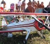 Сегодня облетал самодельную бензиновую Экстру. Размах 1920, длина 1780. Взлётный вес с дюралевым шасси 6700, с проволочным 6500. Мотор GF40 (Kit40). Самолёт летает устойчиво, триммеровал только по высоте (2 щелчка) Тяги хватает «только-только»- на затяжных вертикалях не вытягивает. .Мотор на максимальный режим не смог отрегулировать. С винтом 20х10 максимальные обороты 6000-6100, хотя зимой при обкатке были до 7000. Полётов сделал около десятка. Закончил полёты там же, где не совсем удачно «посадил» Рома своего Яка. Ветер был боковой и приходилось заходить на посадку под углом к полосе. Спасли пластиковые болты крепления шасси. В целом самолёт не пострадал.