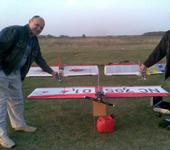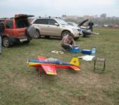 Бои начались с облёта 2х метровой бензиновой бойцовки Андрея. (ТТХ: Вес 3700г, двигатель 26сс бензин, масштаб 1,2/3 от стандартного крыла.). Модель отлично управляется, по словам пилота, не хватало только скорости (по техническим причинам). Подробности можно узнать у производителя/пилота испытателя - Андрея Кузьмина.