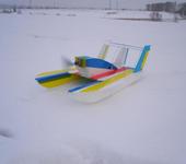 Испытал амфибию, сделанную вчера. Носится как сумашедшая, но летает. На высоте пол метра, метров за 50 от меня, порывом ветра перевернуло мою пенопластину, но приземлилась на лыжи, одна лопасть оторвалась. Пришлось с половинкой винта рулить с бешенной вибрацией, т.к не хотелось по снегу лезть.