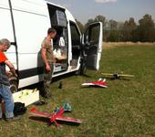 Доброго времени суток всем,5 сентября облетал-таки я свой Rainbow,видео снимать было некому,так что выкладываю пару фоток,летал на таком сетапе:батарея LiPo B Grade 5000mAh 4S 30C,мотор NTM 42-48 650kV 1290Wt,винт apc14"*7",вес 2500гр,тяги хватает и на вертикали и на петли,ветра почти не боится,летит как по рельсам(как в симуляторе)заодно облетал переделанную турнигу под телеметрию FrSky и перепрошитую ER9X-FrSky(теперь турнига показывает на своём дисплее данные телеметрии)передача телеметрических данных происходила до 500 метров далее аппа пискнула о слабом сигнале и я развернул модель,токопотребление в горизонтальном полёте не превысила 54 А ,на вертикалях не смотрел-некогда,как только привыкну к скорости Rainbow перейду на 5ти баночные акки.