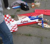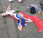 мотошпангоут оторвало. капот превратился в красную тряпку. легкие мотора были забиты песком. мощную грудь фюзеляжа разорвало вдоль. сервы раскидало настолько широко, наколько позволяли провода, воткнутые в приемник. было похоже на осьминога, бак отлетел в сторону. мягкие ткани поролона лежали рядом. лопасть винта раскололась на 3 части.