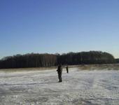 Итак, суббота…Приехав на поле и постояв пару минут на нехилом ветерке я понял, что с облетом моей «бутылки» придется повременить. Тогда , чтобы не терять время , я решил прокатиться в Росинку. Приехав к плотине я обнаружил, что в низине ветра практически нет. На льду водоема, возле берегов, сидело несколько рыбаков. Уточнив у одного, что лед почти 50 см и ходить можно без опаски везде, я вышел на лед с «бутылочником» и старым добрым Бивером(с коллекторным мотором и 7 банками кадмия). Размеры водоема составляют около 100х500 метров и места для электричек вполне хватает. Первым в небо, к всеобщей радости заскучавших рыбаков, пошел Бивер.