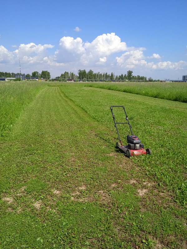 Покосил нормально а вот полетать так и не удалось. После взлёта , минуты через полторы вырубился мотор. Причину не устанавливал, не хватило сил. Самолёт тащил примерно метров 300 а трава выше пояса .Самолётка цел, ничего не сломал .