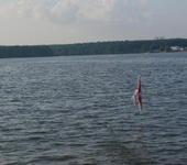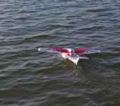 Полетал сегодня опять в гордом одиночестве.Был небольшой ветерок,но терпимо.Волнение на воде тоже нормально-на взлёт не влияло.В крайний полёт решил полихачить-на полном газу на бреющем полёте в полуметре от воды,выглядит эффектно.На втором или третьем проходе не расчитал вертикальную скорость-чирканул по воде.Ещё раз убедился что на скорости вода как асфальт,снесло нафик дно.Результат на фото.Самое интересное что в том момент я и не заметил ничего.Самолёт отскочил от воды с каким то непонятным треском и полетел дальше.Пролетая над собой -смотрю внутренности самолёта просматриваются снизу,дна то нету.Нифига себе думаю…В общем как я не старался ,но без купания не обошлось.Хорошо хоть недалеко от берега.Но минут десять вся электроника была условно под водой.Больше всего переживал за джеэровский приёмник,жалко было.Но ничего просушил дома вроде всё работает,сервы тоже живые.Тьфу Тьфу.