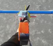 Алексей отлично кинул самолет, но на небольшом удалении опять начались помехи – полетел обратно и видео совсем пропало, снимаю очки и ищу на фоне деревьев самолет и тут БАЦ и все что осталось резво катится по льду 😦