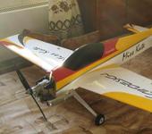 Купленый еще летом б/у Hotpoint, дождался своего часа. Сам самолет находился во вполне приличном состоянии, но моя голова никогда не дает рукам покоя. Решено было использовать имеющийся двигатель MVVS 12,7. Вообще, лучше всего подошла бы легкая десятка типа Enya, но у меня ее нет. Под новый мотор был обрезан фюзеляж примерно на 25мм и изготовлен новый шпангоут. Носовая часть усилена 4мя сосновыми стрингерами. Два верхних, примерно до середины крыла, два нижних, до конца площадки крепления стойки шасси. Сама площадка усилена двумя фанерными косынками в вертикальной и горизонтальной плоскостях и накладкой. Борта в местах выхода стоек также усилены фанерными накладками заподлицо с фюзеляжем. Затем Фюзеляж до задней кромки крыла был оклеен стеклотканью 0.03 на смоле. Сделал новую площадку крепления серв, РН стал пошире на 20мм и вклеил трубки выхода тросов управления. Управление РВ и РН на тросах считаю едва ли не лучшим решением - легкий хвост и отсутствие люфтов. По эстетическим соображениям сделал увеличенный фонарь, покрасил в традиционный черный цвет. Материал - стеклопластик, технология - матрица. Также сделал новый капот идентичный фабричному по форме - родной был слегка покоцан и прорезан не так как хотелось. Пока лежит в сторонке. Прорезать, подгонять и красить буду после отладочных полетов и регулировки выкоса двигателя.