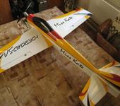 Про обтяжку. У фабричной пленки достоинство только одно - малый вес, поэтому она была безжалостно содрана вся… Купил Oracover и обтянул на свой вкус. Цветовая схема почти стандартная, букавки из Oracal порезаны на плоттере. Сервы РН и РВ HS625MG, элероны - HS422, газ - HS85. Сухая масса 2512г. с родной угольной трубой и на 42г. больше с дюралевой (Андрей напугал, хотя мне кажется, что родная должна выдержать, и та поломка была связана или с производственным дефектом или с повреждением в процессе эксплуатации). Облетать планирую в ближайшие выходные.