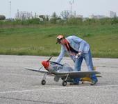 Соревнования начинаются сегодня (регистрация, стенд и полёты с завтрашнего дня) - а модель в первый раз подняли только вчера. Первые два полёта сделал я, потом полетел Сергей. Модель летит относительно спокойно. По сравнению с полукопией ЯК-12 - у этой модели больше размах на 20 см и вес почти на кило. В связи с тем, что выкос мотора вниз оказался мал (около 1 гр.), а переделать его пока не представляется возможным - помог микшер “газ-руль высоты”. Правда, если резко сбросить газ, то мотор не успевает сбросить обороты, а руль высоты поднимается - модель немного вспухает.